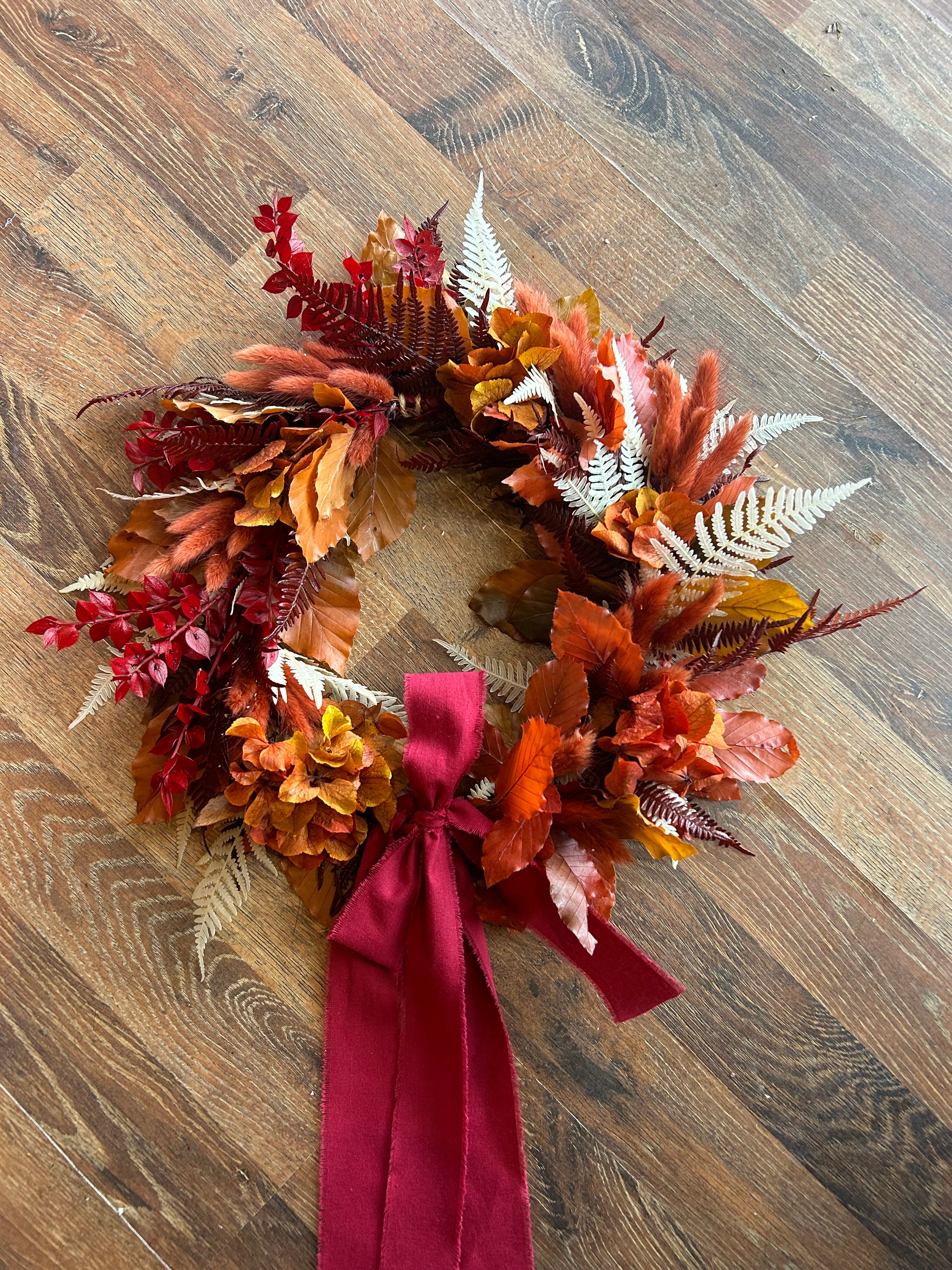 Ghirlanda autunnale con felce, ruscus, laugurus, foglie di faggio.
