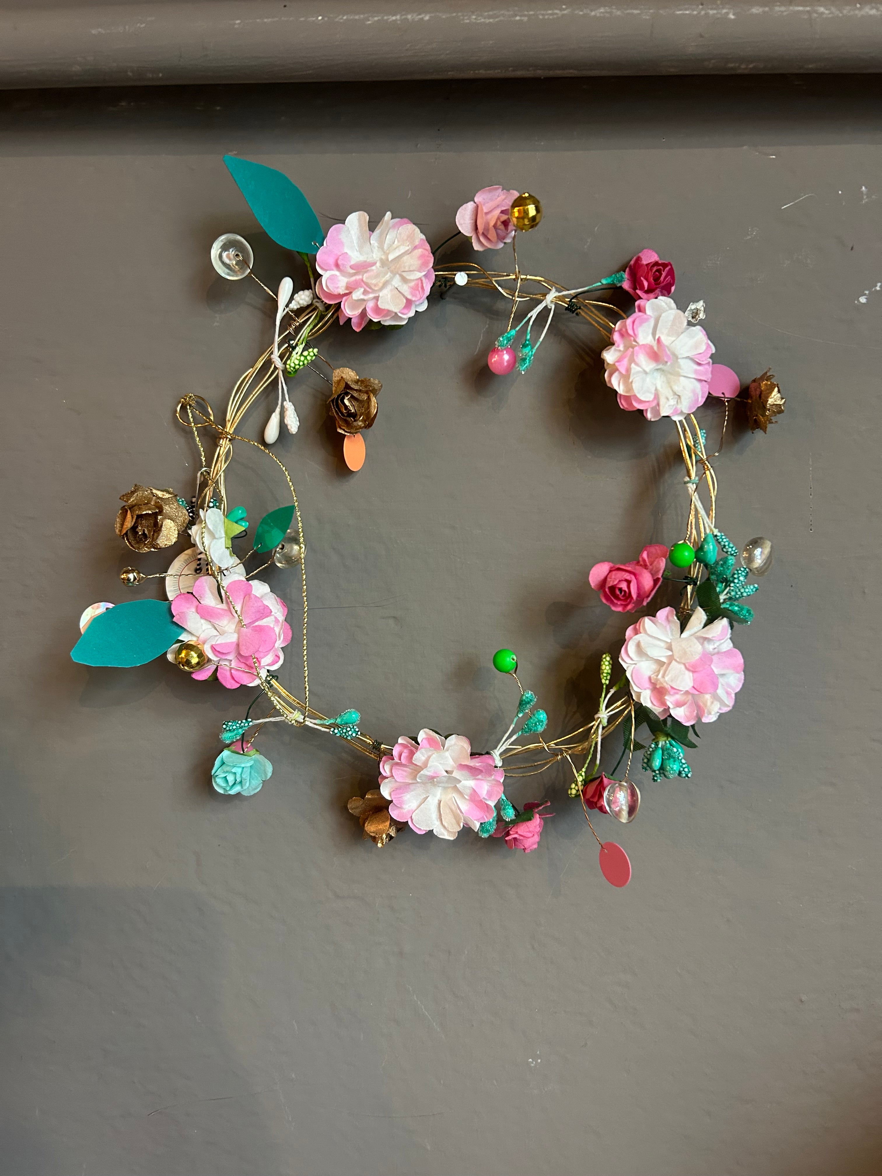 Ghirlanda con base in filo di ferro e perline.